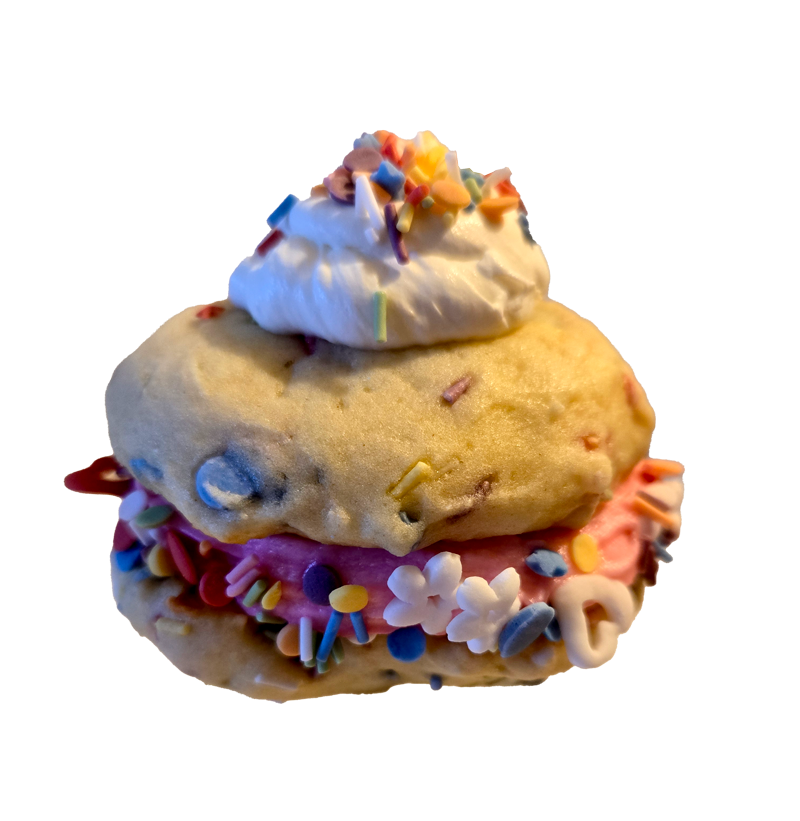 Funfetti whoopie filled with pink cake batter marshmallow filling, raspberry jam, and pop rocks.